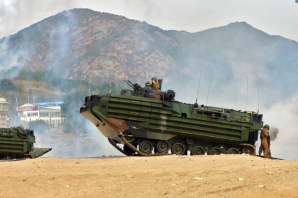 U.S. Marines practice an assault Hwajinri beach by land and air using amphibious assault vehicles and helicopters during an amphibious landing as part of the 2009 Korean Incremental Training Program in Pohang, Republic of Korea, Nov. 6, 2008. The Marines are assigned to the 31st Marine Expeditionary Unit, III Marine Expeditionary Force. U.S. Marine Corps photo by Cpl. Ryan Wicks