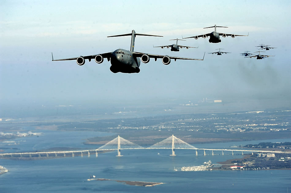 C-17 Globemaster IIIs from the 437th Airlift Wing and 315th AW at Charleston Air Force Base, SC., fly in formation Dec. 18 over Charleston S.C., during an Army strategic brigade airdrop exercise. (U.S. Air Force photo/Tech. Sgt. Jeremy Lock)