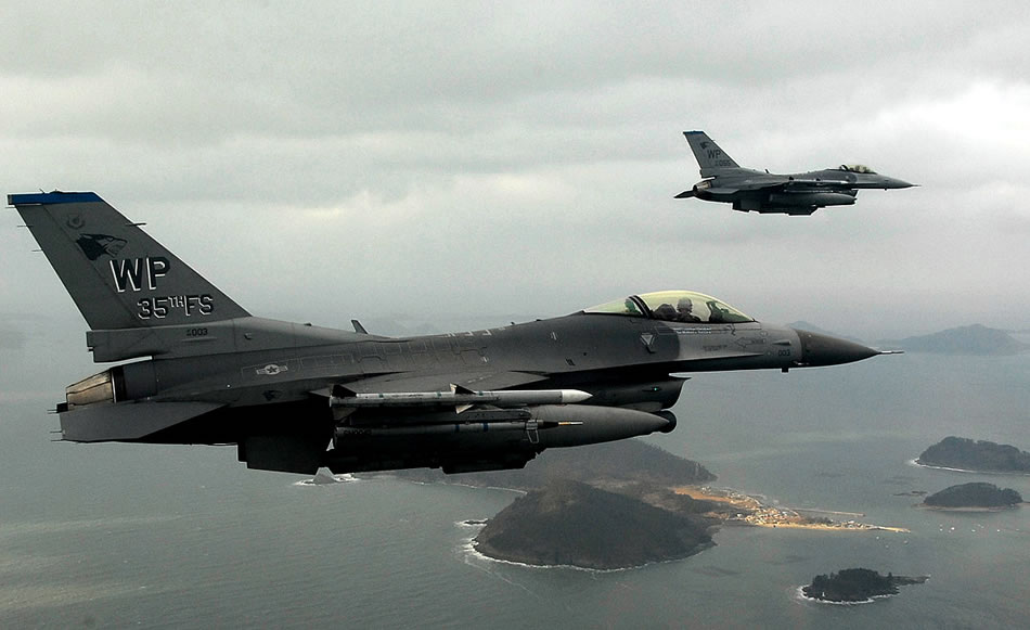 F-16 Fighting Falcons fly on a training mission Jan. 30 over the South Korean peninsula. Pilots assigned to the 35th Fighter Squadron from Kunsan Air Base, South Korea, use training missions to simulate actual conditions they may face in combat and keep their warfighting skills honed. (U.S. Air Force photo/Tech. Sgt Quinton T. Burris)