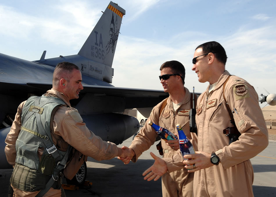Related Article: The One and OnlyBALAD AIR BASE, Iraq -- Lt. Col. George Uribe, 332nd Expeditionary Operations Group fighter pilot, is greeted and congratulated by Col. Steven Shepro, 332nd Air Expeditionary Wing vice commander, and Col. Charles Moore, 332nd Expeditionary Operations Group commander, after completing 1,000 combat flying hours as an F-16 Fighting Falcon pilot here, Feb. 17. Colonel Uribe is deployed from Tyndall Air Force Base, Fla. (U.S. Air Force photo/ Senior Airman Julianne Showalter)