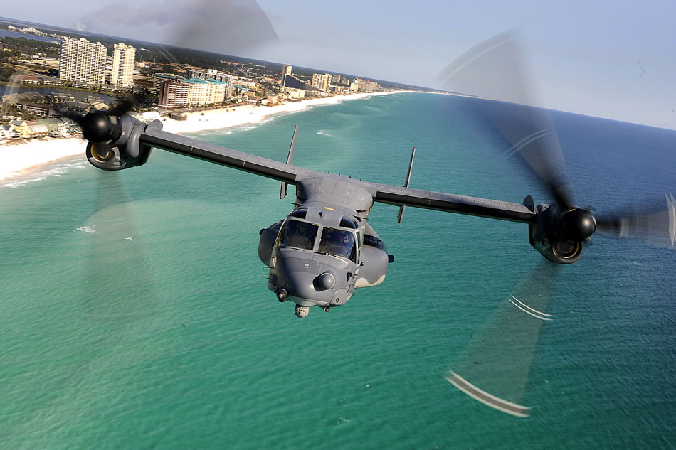 A CV-22 Osprey flies over Florida's Emerald Coast, Jan. 31, 2009. The crew and aircraft are assigned to the 8th Special Operations Squadron, Hurlburt Field, Fla. While over the water, the crew practiced using the hoist, a means to rescue stranded personnel. U.S. Air Force photo by Senior Airman Julianne Showalter