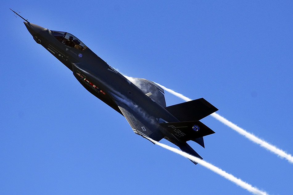 An F-35 Lightning II flies overhead for the first time on Elgin Air Force Base, Fla., April 23, 2009. The aircraft is the first at Eglin, which will be the future home of the Joint Strike Fighter training facility. U.S. Air Force photo by Senior Airman Julianne Showalter