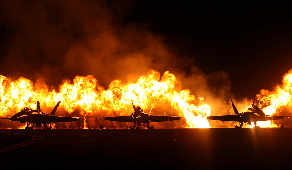 The main attraction of the 2009 Marine Corps Air Station Miramar Air Show went off with a bang at approximately 9 p.m. Oct. 3 silhouetting the F/A-18 Hornets with the U.S. Navy Jet Demonstration Squadron "The Blue Angels." The "Wall of Fire" is in the "Guinness Book of World Records" as the longest exploding line of ordnance in 2000.