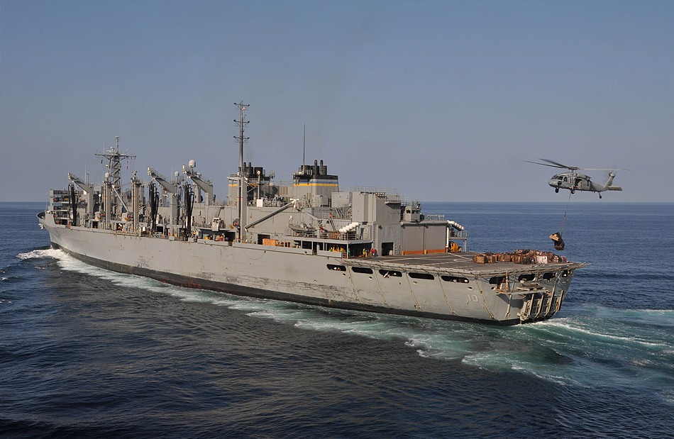 NORTH ARABIAN SEA (Dec. 17, 2009) An MH-60S Sea Hawk helicopter assigned to the Wildcards of Helicopter Sea Combat Squadron (HSC) 23, delivers pallets to the Military Sealift Command fast combat support ship USNS Bridge (T-AOE 10) during a replenishment at sea with the aircraft carrier USS Nimitz (CVN 68). The Nimitz Carrier Strike Group is on a routine deployment to the U.S. 5th Fleet area of responsibility. (U.S. Navy photo by Mass Communication Specialist 1st Class David Mercil)