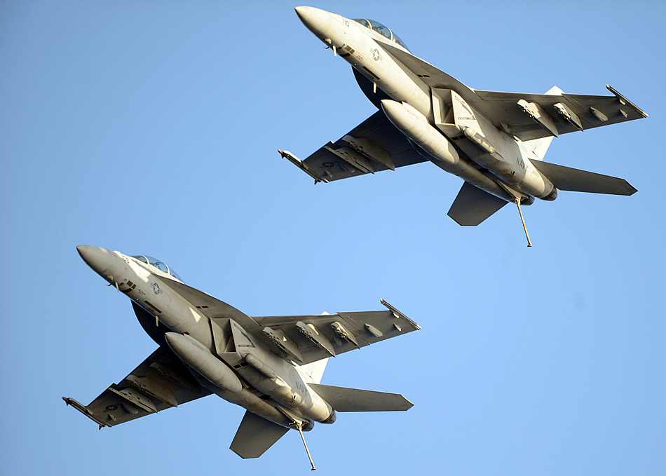 ATLANTIC OCEAN (Oct. 16, 2010) Two F/A-18F Super Hornets assigned to the Red Rippers of Strike Fighter Squadron (VFA) 11 fly in formation over the aircraft carrier USS Enterprise (CVN 65). The Enterprise Carrier Strike Group is conducting a Composite Training Unit Exercise in preparation for an upcoming deployment. (U.S. Navy photo by Mass Communication Specialist Seaman Jared M. King)