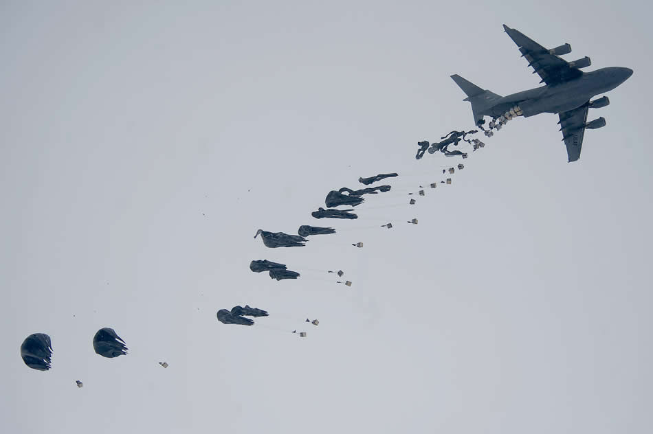 A C-17 Globemaster III air delivers bundles of fuel to Forward Operating Base Waza K'wah in the Paktika province of Afghanistan. The fuel was part of an air delivery to help sustain members of Task Force Currahee, 4th Brigade, 101st Airborne Division, whose only means of re-supply is through air delivery. (U.S. Air Force photo/Master Sgt. Adrian Cadiz)