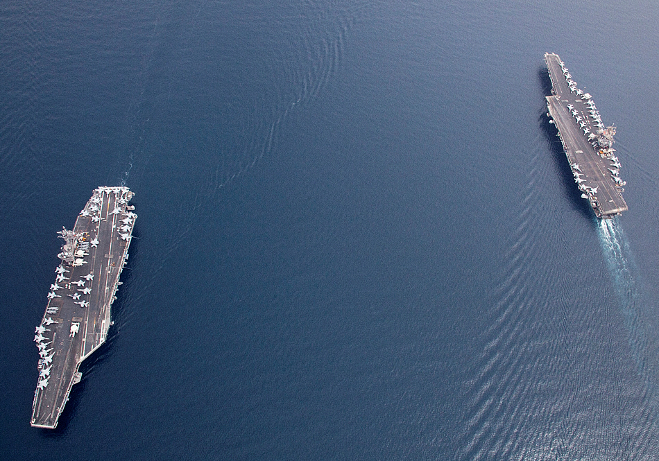 RED SEA (June 21, 2011) The Navy's oldest aircraft carrier, USS Enterprise (CVN 65), right, passes the Navy's newest aircraft carrier, USS George H.W. Bush (CVN 77), during a transit of the Strait of Bab el Mandeb. George H.W. Bush arrives in the U.S. 5th Fleet area of responsibility to take over operations for Enterprise. (U.S. Navy photo by Mass Communication Specialist 2nd Class Brooks B. Patton Jr.)
