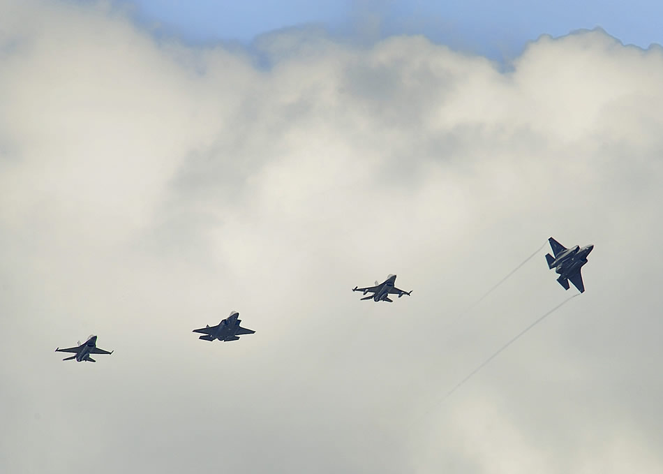 Two F-35A Lightning II joint strike fighters were delivered to Eglin Air Force Base, Fla., with 33rd Fighter Wing-piloted F-16 Fighting Falcons escorting the jets to their new home Aug. 31, 2011. Labeled as AF-10 and AF-11 by Lockheed Martin, the JSFs bring the total count of the fifth-generation fighter aircraft at Eglin AFB to four. (U.S. Air Force photo/Staff Sgt. Joely Santiago)
