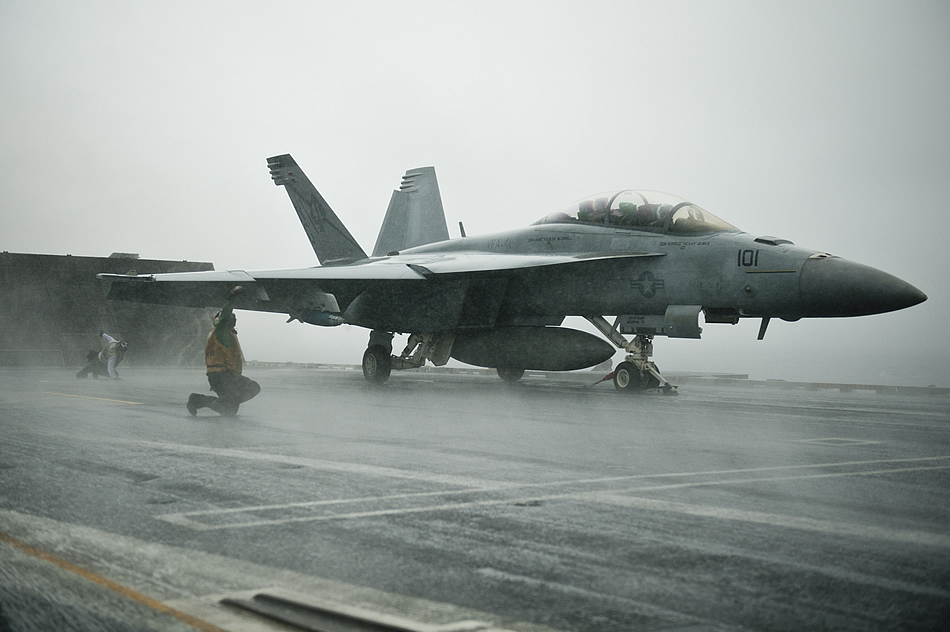 INDIAN OCEAN (Sept. 12, 2011) Sailors conduct pre-flight checks on an F/A-18F Super Hornet assigned to the Black Aces of Strike Fighter Squadron (VFA) 41 aboard the Nimitz-class aircraft carrier USS John C. Stennis (CVN 74). The John C. Stennis Carrier Strike Group is on a scheduled deployment to the western Pacific Ocean and the Arabian Gulf. (U.S. Navy photo by Mass Communication Specialist 3rd Class Benjamin Crossley)