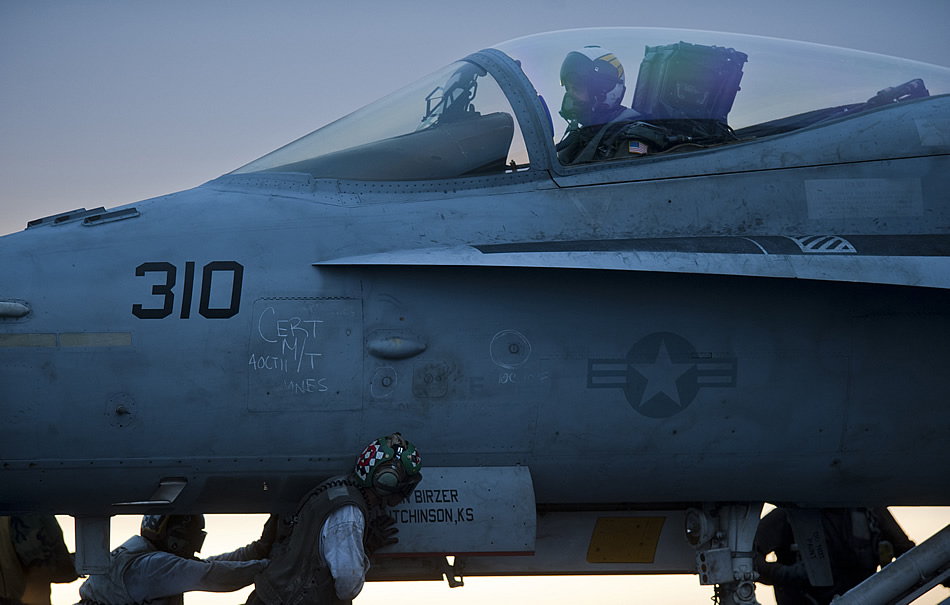 PACIFIC OCEAN (Oct. 5, 2011) Sailors push back an F/A-18C Hornet assigned to the Vigilantes of Strike Fighter Squadron (VFA) 151 aboard the Nimitz-class aircraft carrier USS Abraham Lincoln (CVN 72). Abraham Lincoln is underway conducting a composite training unit exercise. (U.S. Navy photo by Mass Communication Specialist 3rd Class Travis K. Mendoza)
