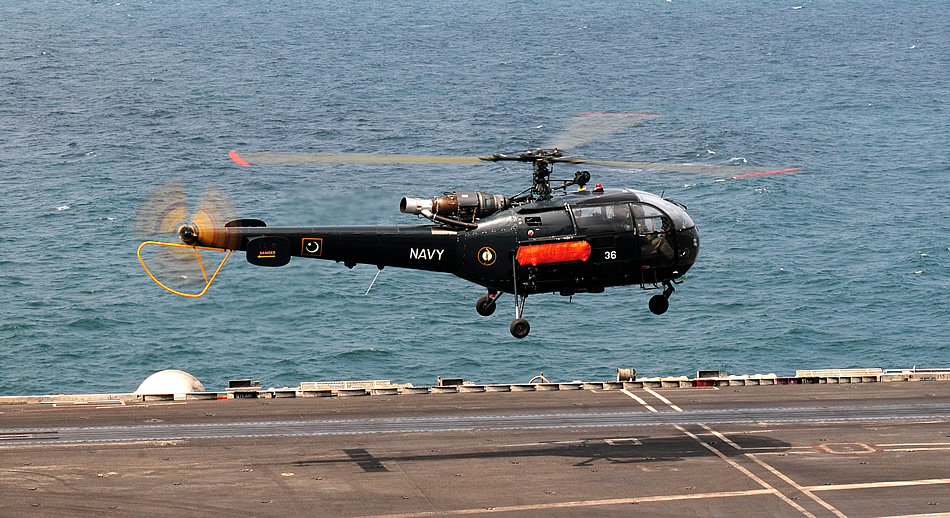 ARABIAN SEA (Sept. 28, 2011) A Pakistan navy SA-319B Alouette III helicopter lands aboard the aircraft carrier USS George H.W. Bush (CVN 77). Personnel assigned to the Pakistan navy destroyer PNS Shahjahan (DDG 186) visited George H.W. Bush for a coordinated professional exchange while the two ships were operating in the vicinity of one another in the Arabian Sea. George H.W. Bush is deployed to the U.S. 5th Fleet area of responsibility on its first operational deployment conducting maritime security operations and support missions as part of Operations Enduring Freedom and New Dawn. (U.S. Navy photo by Mass Communication Specialist 3rd Class Billy Ho)