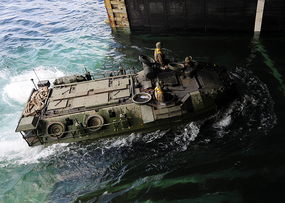 SOUTH CHINA SEA (Nov. 1, 2011) An amphibious assault vehicle assigned to the 31st Marine Expeditionary Unit enters the well deck of the forward-deployed amphibious dock landing ship USS Germantown (LSD 42). Germantown is part of the Essex Amphibious Ready Group and is conducting operations in the western Pacific region. (U.S. Navy photo by Mass Communication Specialist 2nd Class Casey H. Kyhl)