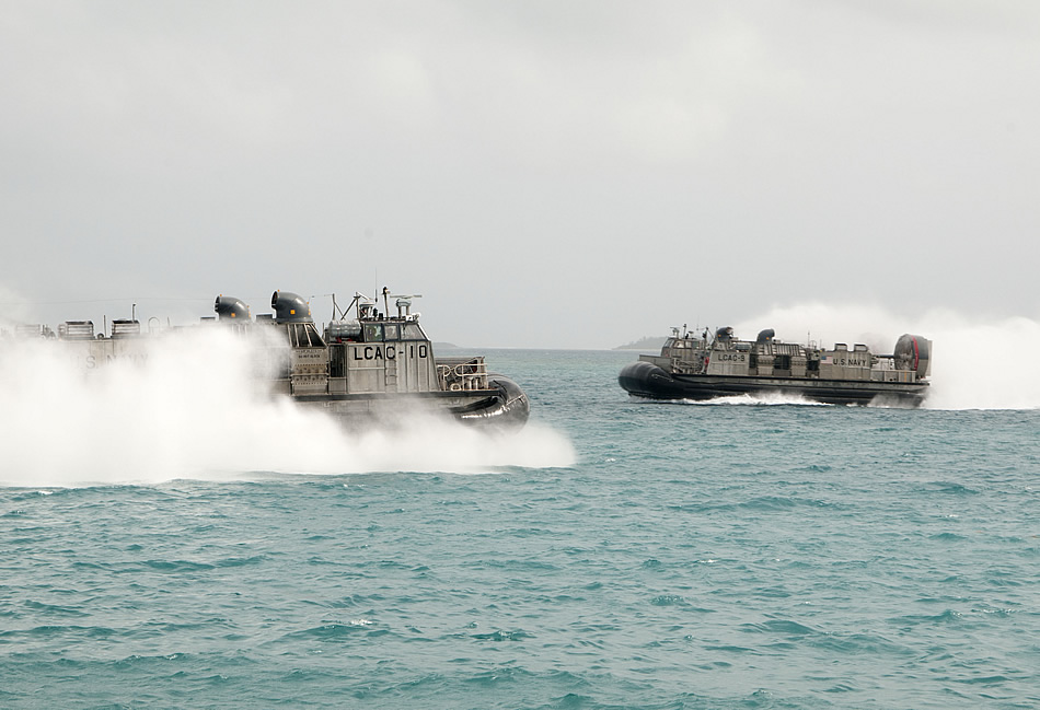 OKINAWA, Japan (Nov. 4, 2011) Landing craft air cushion vehicles assigned to Assault Craft Unit (ACU) 5 transport equipment and vehicles of the 31st Marine Expeditionary Unit (31st MEU) from the forward-deployed amphibious assault ship USS Essex (LHD 2) to White Beach Naval Facility. Essex offloaded elements of the 31st MEU after completing Amphibious Landing Exercise (PHIBLEX) with the Armed Forces of the Philippines. Essex is part of the Essex Amphibious Ready Group and is conducting operations in the western Pacific region. (U.S. Navy photo by Seaman Sade T. Lucas)