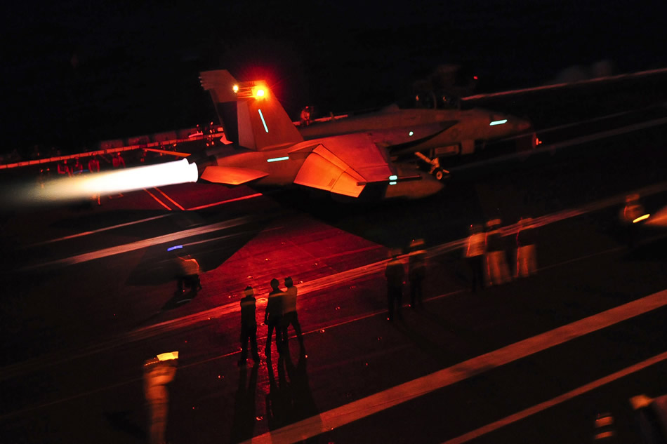 An F/A-18F Super Hornet launches from the flight deck of the Nimitz-class aircraft carrier USS Carl Vinson under way in the Pacific Ocean, Dec. 10, 2011. U.S. Navy photo by Seaman Apprentice Dean M. Cates