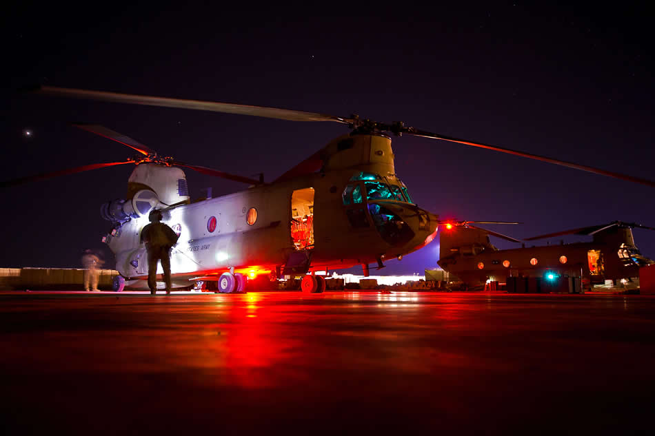 U.S. Army Staff Sgt. Carlos Gonzales and Sgt. Ernesto Gallegos assist pilots during a run up of a CH-47F Chinook helicopter on Camp Marmal, Afghanistan, Feb. 16, 2012. Gonzales is a flight engineer instructor and Gallegos is a crew chief. Both are assigned to the 1st Cavalry Division's Company B, 1st Air Cavalry Brigade, Task Force Lobos. U.S. Air Force photo by Sgt. Felix Acevedo