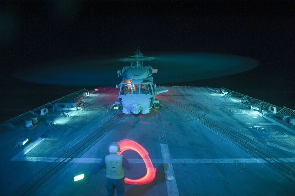 GULF OF ADEN (June 15, 2012) A Sailor directs an SH-60B Sea Hawk helicopter as it prepares to shut down after landing aboard the guided-missile destroyer USS Nitze (DDG 94). Nitze is deployed as part of Enterprise Carrier Strike Group to the U.S. 5th Fleet area of responsibility conducting maritime security operations, theater security cooperation efforts and support missions as part of Operation Enduring Freedom. (U.S. Navy photo by Mass Communication Specialist 3rd Class Jeff Atherton)