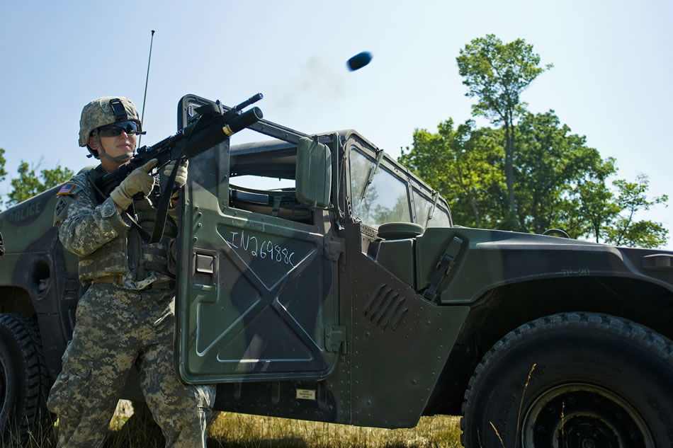 Army Sgt. Samantha Houston, right, assists Spc. Joshua Tarazona, left, in firing an M203 grenade launcher on Camp Atterbury, Ind., June 21, 2012. Houston and Tarazona, both military policemen, are assigned to the 81st Troop Command, Indiana National Guard. U.S. Army photo by Sgt. John Crosby