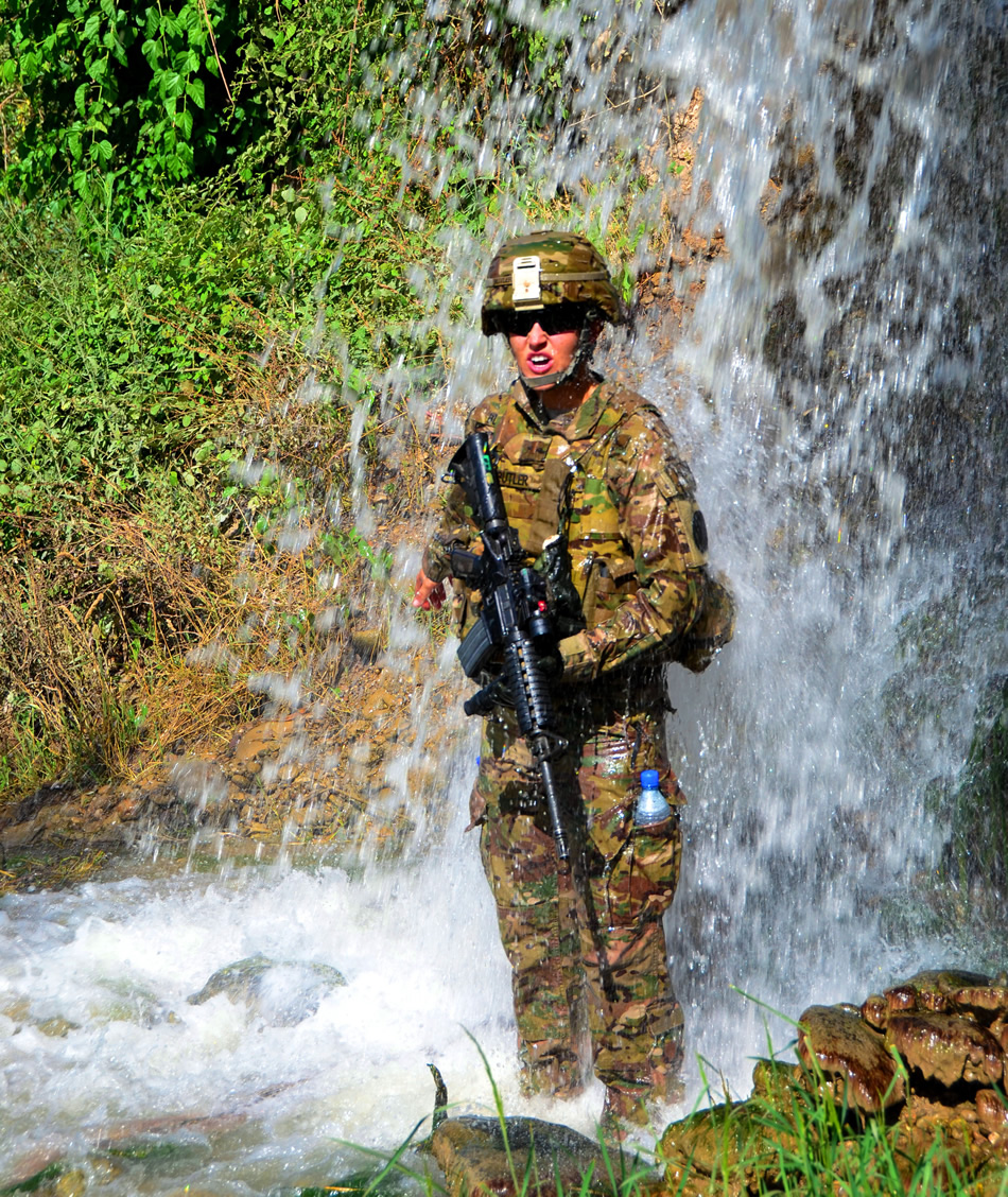 Second Lt. Cari Butler, a public affairs officer with the 117th Mobile Public Affairs Detachment, Hawaii Army National Guard, stands under a waterfall to cool off during a patrol near Check Point Naychin, Afghanistan, June 30, 2012. Photo by117th Mobile Public Affairs Detachment (Hawaii)