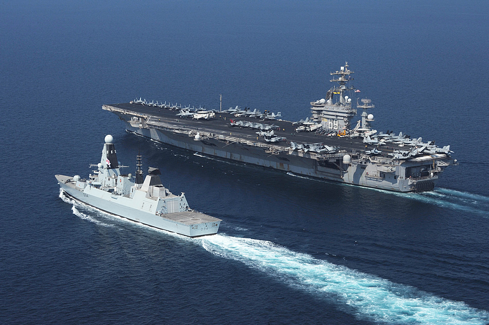 U.S. 5TH FLEET AREA OF RESPONSIBILITY (Nov. 4, 2012) The Royal Navy destroyer HMS Diamond (D34) is underway alongside the aircraft carrier USS Dwight D. Eisenhower (CVN 69). Dwight D. Eisenhower is deployed to the U.S. 5th Fleet area of responsibility conducting maritime security operations, theater security cooperation efforts and support missions for Operation Enduring Freedom. (U.S. Navy photo by Mass Communication Specialist 3rd Class Ryan D. McLearnon)