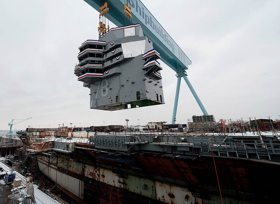 NEWPORT NEWS, Va. (Jan. 26, 2013) Huntington Ingalls Industries celebrated significant progress today as the 555-metric ton island was lowered onto the nuclear-powered aircraft carrier Gerald R. Ford (CVN 78) at the company's Newport News Shipbuilding (NNS) division. The 60-foot long, 30-foot wide island was the 452nd lift of the nearly 500 total lifts needed to complete the aircraft carrier. (U.S. Navy photo courtesy Huntington Ingalls Industries)