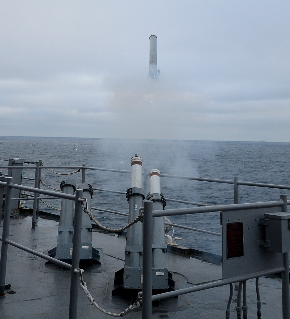 ATLANTIC OCEAN (Feb. 8, 2013) A chaff round is launched from the amphibious dock landing ship USS Carter Hall (LSD 50) during a live fire exercise. Carter Hall is participating in Composite Training Unit Exercise (COMPTUEX) off the East Coast of the U.S. in preparation for a deployment this spring. (U.S. Navy photo by Mass Communication Specialist 3rd Class Chelsea Mandello)