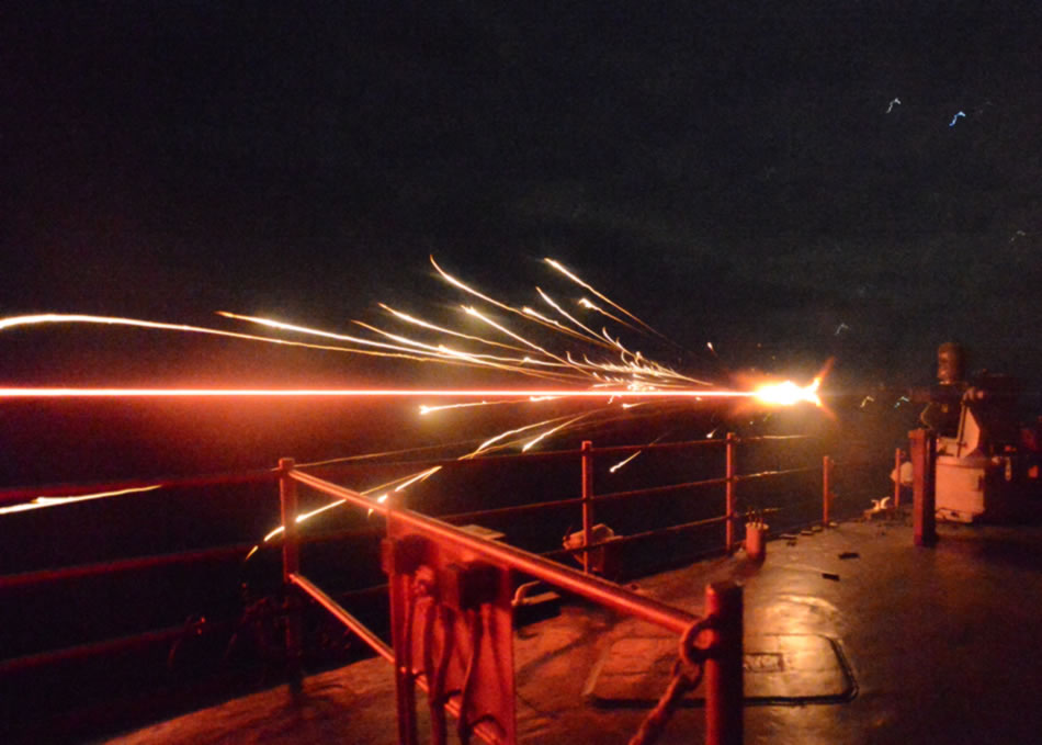 ATLANTIC OCEAN (Feb. 6, 2013) A 25 mm machine gun fires during a live fire exercise aboard the amphibious dock landing ship USS Carter Hall (LSD 50). Carter Hall is participating in Composite Training Unit Exercise (COMPTUEX) off the East Coast of the U.S. in preparation for a deployment this spring. (U.S. Navy photo by Mass Communication Specialist 3rd Class Chelsea Mandello)