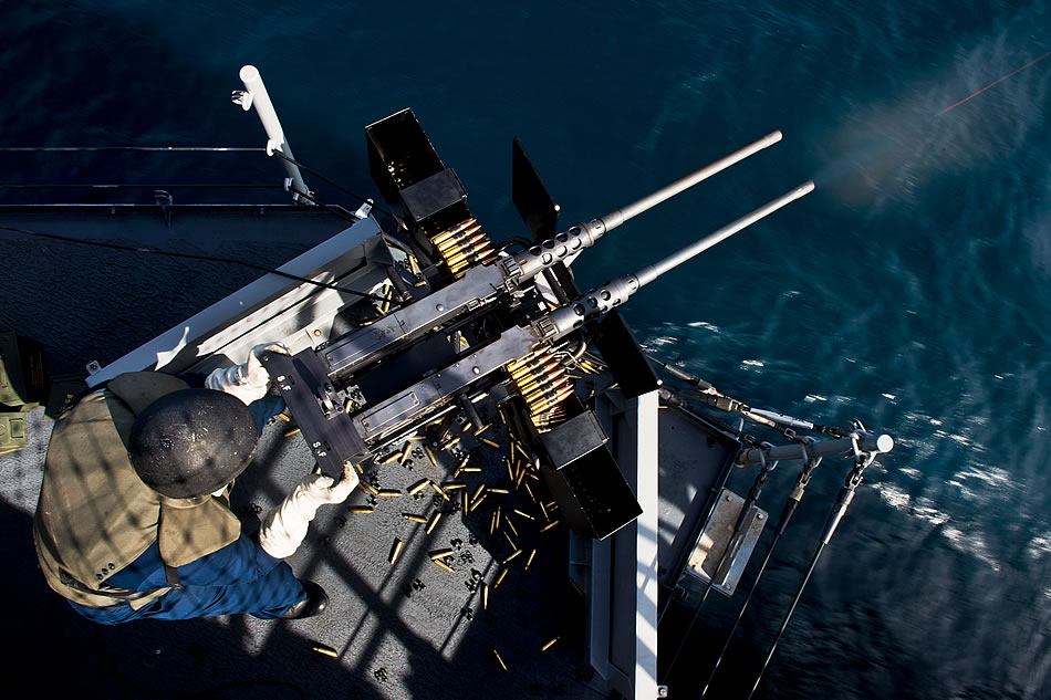 Navy Petty Officer 2nd Class Justin Butts fires twin .50 caliber machine guns during a live-fire training exercise on the amphibious assault ship USS Boxer in the Pacific Ocean, March 26, 2013. Boxer is under way conducting training off the coast of Southern California. U.S. Navy photo by Petty Officer 2nd Class Jason T. Poplin