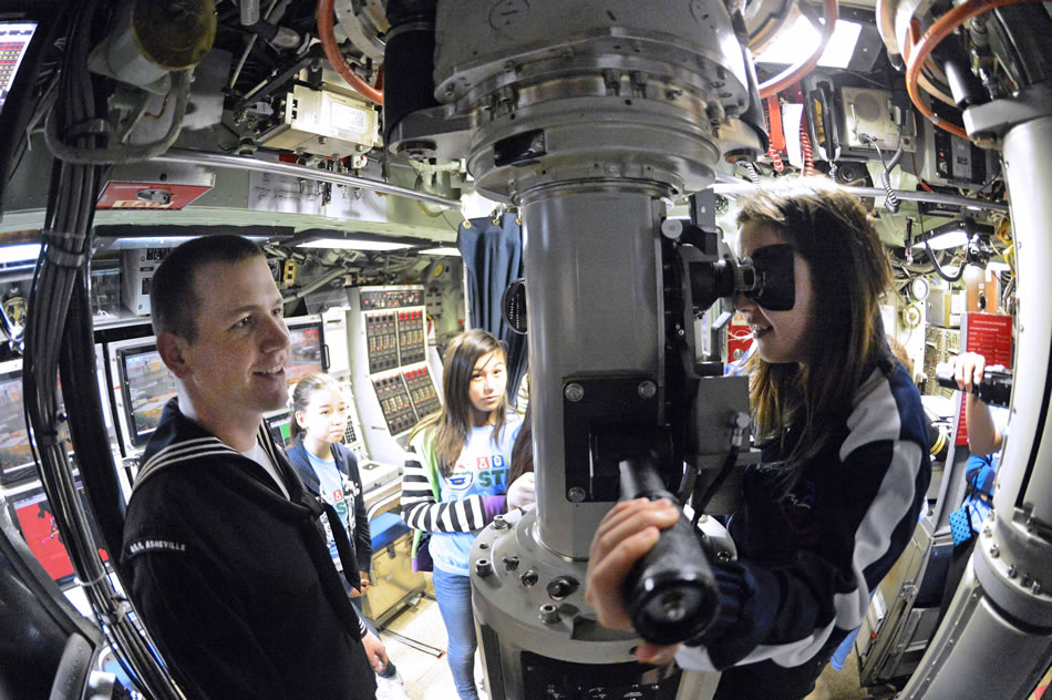 YOKOSUKA, Japan (April 17, 2013) Fire Control Technician 3rd Class Corey Wilkins, assigned to the Los Angeles-class attack submarine USS Asheville (SSN 758), gives a tour of the submarine to middle school students from Camp Zama and Fleet Activities Yokosuka during a Girls' Science, Technology, Engineering and Math (STEM) event. The Navy's "STEM for the Classroom" program encourages students to discover academic pursuits and career opportunities in the science and technology fields and allows students to explore the latest STEM technologies used in the Navy. (U.S. Navy photo by Mass Communication Specialist 3rd Class Declan Barnes)