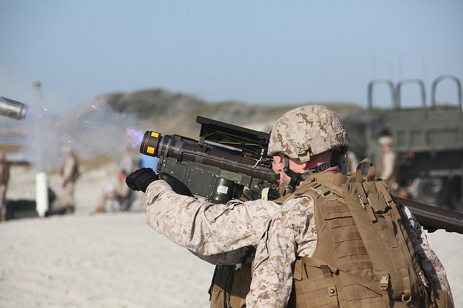 MARINE CORPS BASE CAMP LEJEUNE, North Carolina - Flames blow out of the launcher as Cpl. Nicholas Zeien, a gunner with 2nd Low Altitude Air Defense Battalion, fires a PL-87 Stinger missile at a drone flying off of Onslow Beach on Camp Lejeune during the second day of the battalions live-fire exercise April 17. The Stinger has a range of more than 6 kilometers and weighs more than 34 pounds. The missile can be fired from the shoulder firing system, a vehicle-mounted firing system or an aircraft. Photo By: Lance Cpl. Cory D. Polom