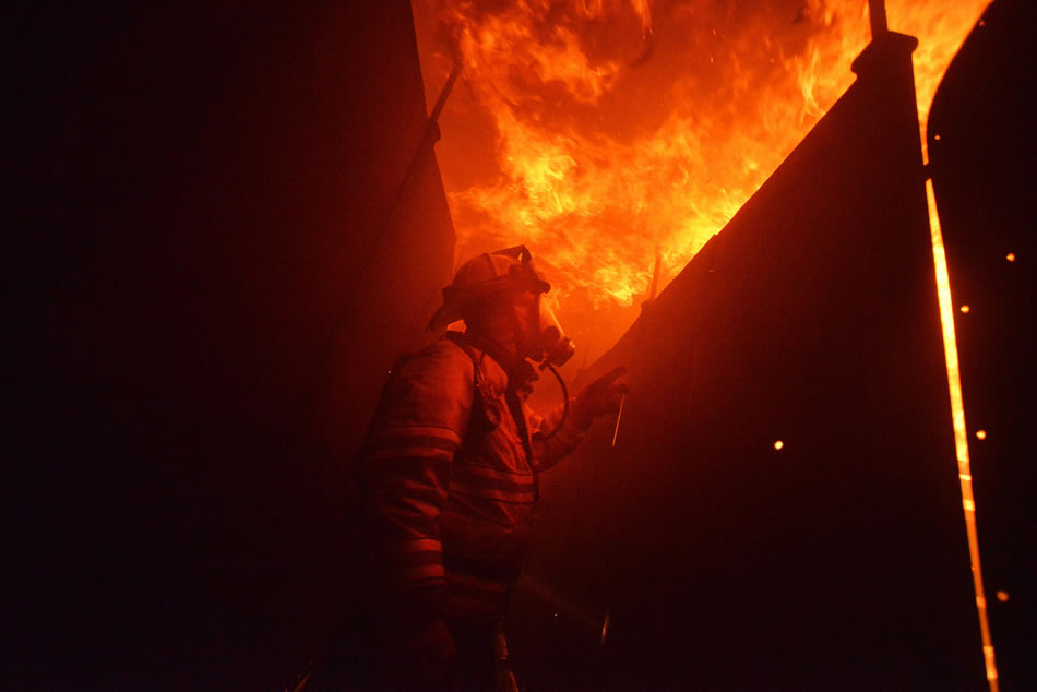 A New York Air National Guard firefighter assigned to the 106th Rescue Wing, based at FS Gabreski Air National Guard Base in Westhampton Beach, N.Y., ducks under flames during training at the Suffolk County Fire Academy here during their monthly drill Aug. 6-8, 2013. The firefighters reviewed basic skills in a realistic training environment under the eye of civilian firefighter trainers. (U.S. Air National Guard photo by Senior Airman Christopher S Muncy 106th Rescue Wing )
