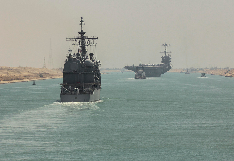 SUEZ CANAL (Aug. 18, 2013) The guided-missile cruiser USS San Jacinto (CG 56) follows the aircraft carrier Harry S. Truman (CVN 75) during a Suez Canal transit with the Harry S. Truman Carrier Strike Group. The carrier strike group is deployed in support of maritime security operations and theater security cooperation efforts in the U.S. 5th Fleet area of responsibility. (U.S. Navy photo by Mass Communication Specialist 2nd Class Rob Aylward)