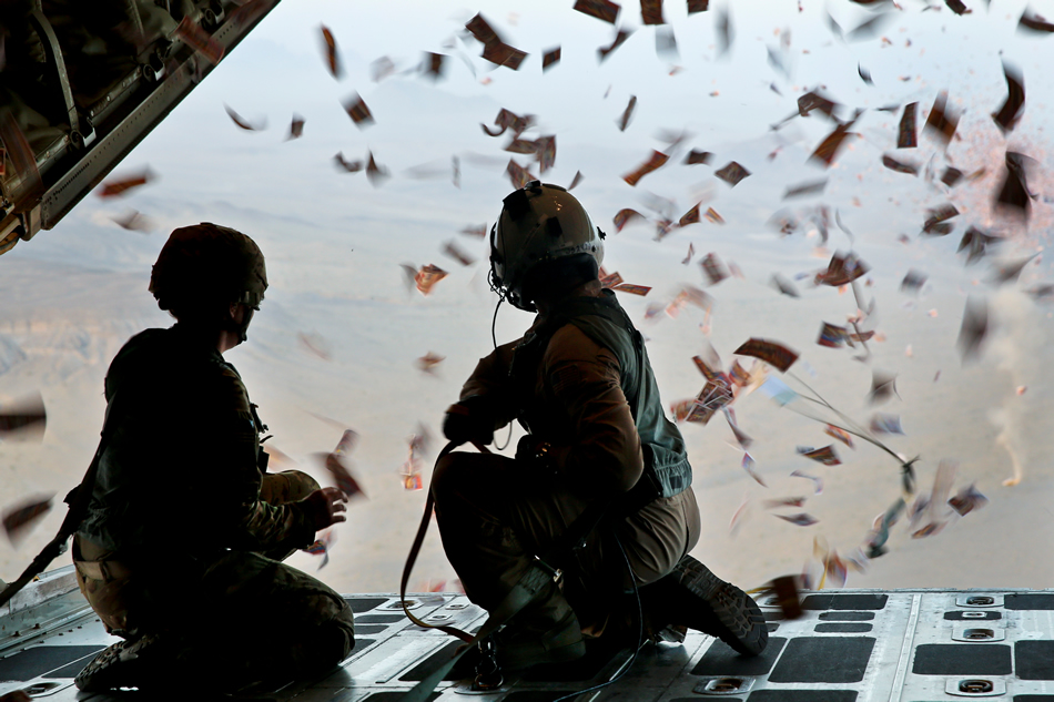 U.S. Army Sgt. Lisa Swan, left, psychological specialist with 303rd psychological operations company (303rd POCO), and U.S. Marine Corps Sgt. Joseph Szombathelyi, right, load master with Marine Aerial Refueler Transport Squadron 252 (VMGR-252), watch leaflets fall off of a KC-130 Super Hercules over southern Afghanistan, Aug. 28, 2013. Leaflets were dropped in support of operations to defeat insurgency influence in the area. U.S. Marine Corps photo by Sgt. Demetrius Munnerlyn