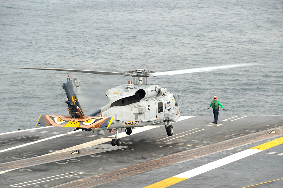 PACIFIC OCEAN (Sept. 13, 2013) An MH-60R Sea Hawk helicopter from the Saberhawks of Helicopter Maritime Strike Squadron (HSM) 77 lands on the flight deck of the U.S. Navy's forward-deployed aircraft carrier USS George Washington (CVN 73) during the air wing fly-on. George Washington and its embarked air wing, Carrier Air Wing (CVW) 5, provide a combat-ready force that protects and defends the collective maritime interest of the U.S. and its allies and partners in the Indo-Asia-Pacific region. (U.S. Navy photo by Mass Communication Specialist 3rd Class Ramon G. Go)