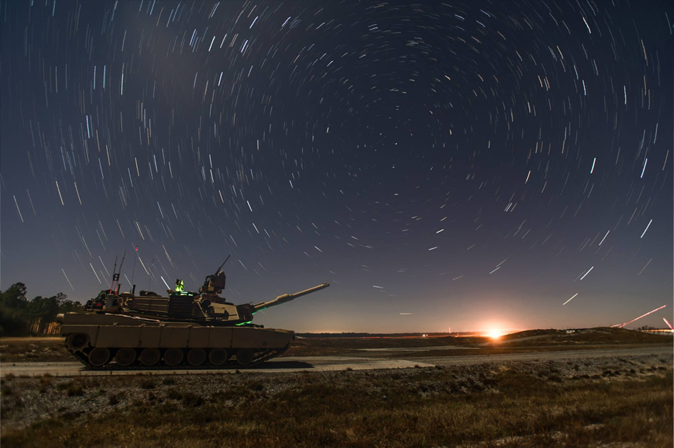 An M1A2SEP Abrams Tank from Company C, 1st Battalion, 64th Armor Regiment Desert Rogues, 2nd Armored Brigade Combat Team, 3rd Infantry Division, sits ready while others complete the night portion of the Gunnery Table VI in the background at Red Cloud Range, Dec. 12. (U.S. Army photo by Sgt. Richard Wrigley, 2nd ABCT, 3rd ID, Public Affairs NCO)