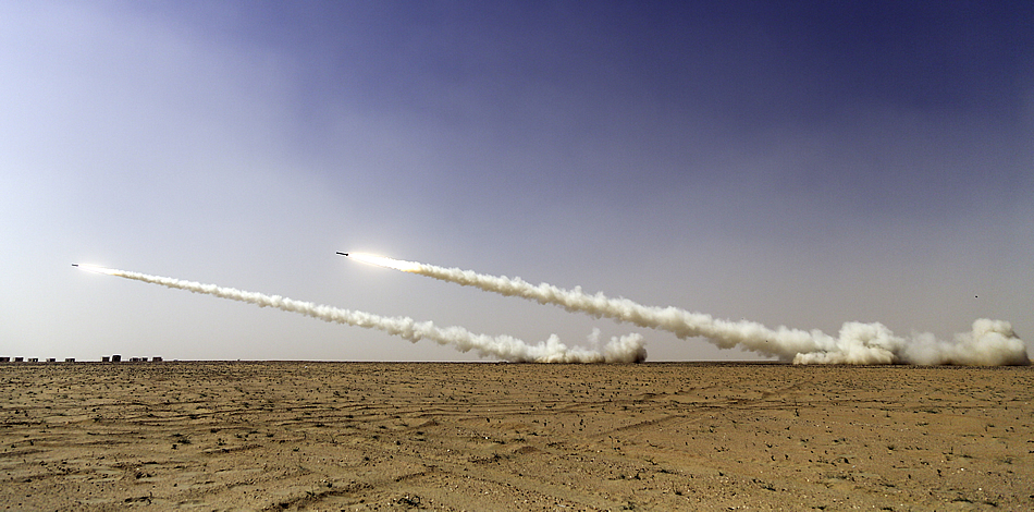 Two M142 High Mobility Artillery Rocket Systems assigned to the 41st Fires Brigade, Fort Hood, Texas, fire rockets during a live fire at the Udairi Range Complex, Camp Buehring, Kuwait, March 13, 2014. The Headquarters and Headquarters Battery, 3rd Battalion, 16th Field Artillery Regiment, 2nd Armored Brigade Combat Team, 4th Infantry Division provided radar coverage as Company C, 2nd Battalion, 8th Infantry Regiment, 2nd ABCT provided forward observers to the live fire. (U.S. Army Photo by Sgt. Marcus Fichtl, 2nd ABCT PAO, 4th Infantry Division)