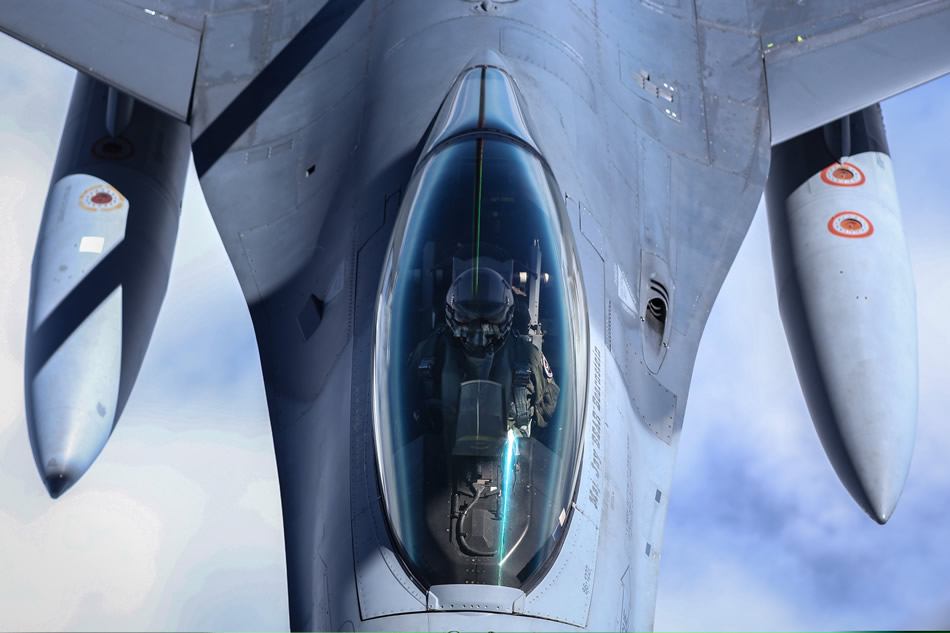 A U.S. Air Force F-16 Fighting Falcon aircraft receives fuel from a KC-135 Stratotanker aircraft assigned to the 507th Air Refueling Wing during an aerial refueling near Hawaii July 26, 2014, as part of Rim of the Pacific (RIMPAC) 2014. RIMPAC is a U.S. Pacific Fleet-hosted biennial multinational maritime exercise designed to foster and sustain international cooperation on the security of the world's oceans. (DoD photo by Staff Sgt. Caleb Wanzer, U.S. Air Force)
