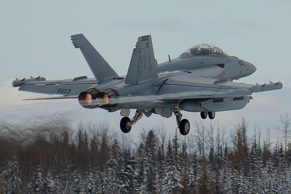 A U.S. Navy EA-18G Growler aircraft assigned to Electronic Attack Squadron (VAQ) 133 takes off from Eielson Air Force Base, Alaska, Oct. 6, 2014, during Red Flag-Alaska (RF-A) 15-1. RF-A is a series of Pacific Air Forces commander-directed field training exercises for U.S. and partner nation forces, providing combined offensive counter-air, interdiction, close air support, and large force employment training in a simulated combat environment. (DoD photo by Tech. Sgt. Joseph Swafford Jr., U.S. Air Force)