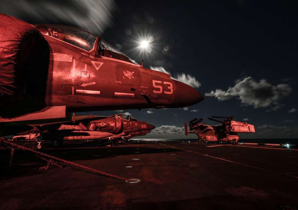 MEDITERRANEAN SEA (Oct. 8, 2014) AV-8B Harriers and an MV-22 Osprey sit on the flight deck at night aboard the amphibious assault ship USS Bataan (LHD 5). The Bataan Amphibious Ready Group is on a scheduled deployment supporting maritime security operations, providing crisis response capability and theater security cooperation efforts in the U.S. 6th Fleet area of responsibility. (U.S. Navy photo by Mass Communication Specialist 3rd Class Erik Foster)