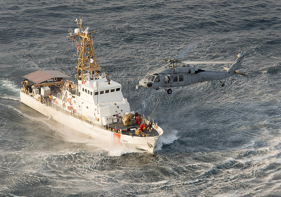 Helicopter Sea Combat Squadron (HSC) 26, Det. 1 conduct a vertical onboard delivery with United States Coast Guard Cutter Maui (WPB 1304). HSC-26, Det. 1 is a Forward Deployed Naval Force (FDNF) asset attached to Commander, Task Force (CTF) 53 to provide combat logistics and search and rescue capability throughout the U.S. 5th Fleet area of responsibility. (U.S. Navy photo by Mass Communication Specialist 1st Class Joan E. Jennings)
