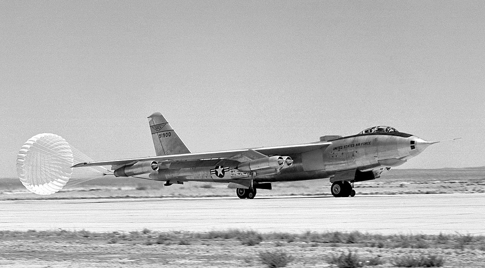 1953 - B-47A lands with a drag chute.