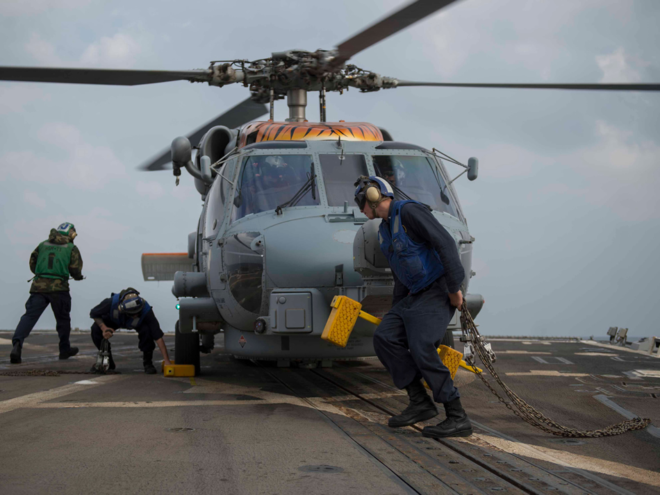 U.S. 5TH FLEET AREA OF RESPONSIBILITY (Jan. 21, 2015) Sailors remove chocks and chains from an MH-60R Sea Hawk helicopter from the Battle Cats of Helicopter Maritime Strike Squadron (HSM) 73 prior to lifting off the flight deck of the guided-missile destroyer USS Dewey (DDG 105). Dewey is deployed in the U.S. 5th Fleet area of responsibility supporting Operation Inherent Resolve, strike operations in Iraq and Syria as directed, maritime security operations, and theater security cooperation efforts in the region. (U.S. Navy photo by Mass Communication Specialist 3rd Class James Vazquez)