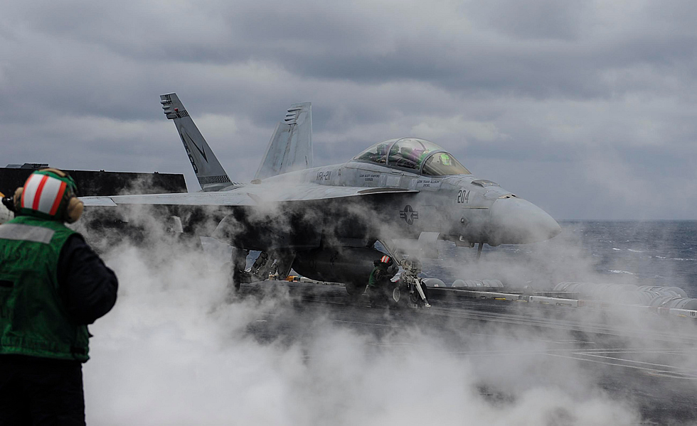 ATLANTIC OCEAN (Feb. 5, 2015) An F/A-18F Super Hornet attached to the Checkmates of Strike Fighter Attack Squadron (VFA) 211 moves into position to be launched from the flight deck of the Nimitz-class aircraft carrier USS Theodore Roosevelt (CVN 71). Theodore Roosevelt is underway participating in a composite training unit exercise, which tests the Theodore Roosevelt Carrier Strike Group's ability to effectively react to real-world scenarios and perform as an integrated unit. (U.S. Navy photo by Mass Communication Specialist 3rd Class Anthony N. Hilkowski)