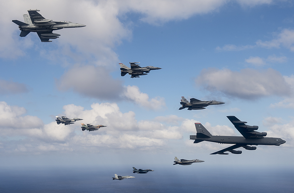 U.S. Air Force, Japan Air Self-Defense Force and Royal Australian Air Force aircraft fly in formation during a photo exercise at Cope North 15, Feb. 17, 2015, off the coast of Guam. Through training exercises such as Exercise Cope North 15, the U.S., Japan and Australia air forces develop combat capabilities, enhancing air superiority, electronic warfare, air interdiction, tactical airlift and aerial refueling. (U.S. Air Force photo by Tech. Sgt. Jason Robertson)