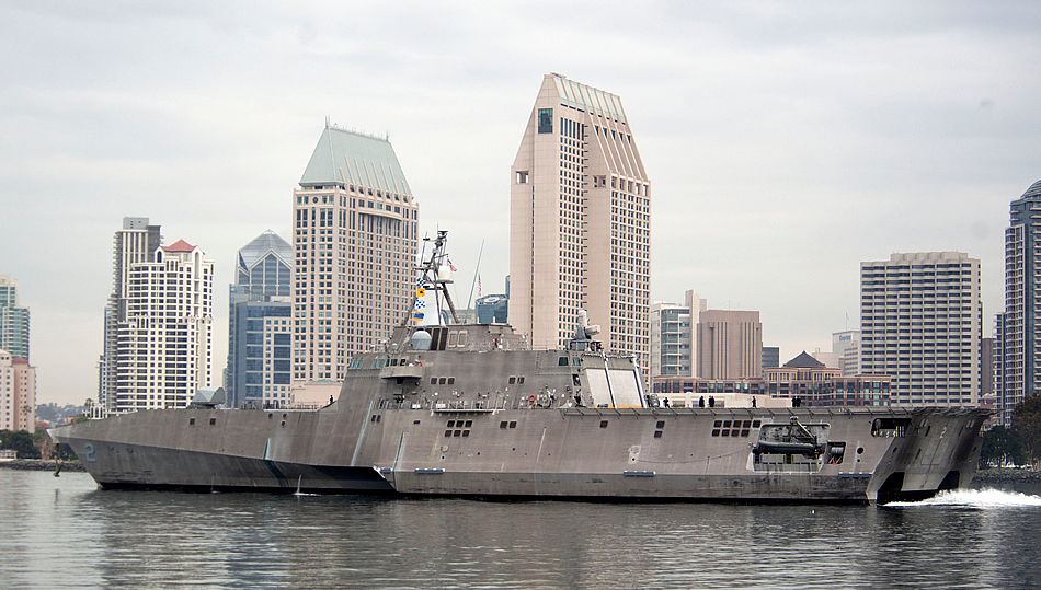 SAN DIEGO (Jan. 30, 2015) The littoral combat ship USS Independence (LCS 2) departs San Diego for Pensacola, Fla., to conduct operational evaluation and testing of the mine countermeasures mission package. Independence will transit the U.S. 4th Fleet area of responsibility, transiting the Panama Canal and making a port visit to Cartagena, Colombia, before arriving in Florida. (U.S. Navy photo by Senior Chief Mass Communication Specialist Donnie W. Ryan)