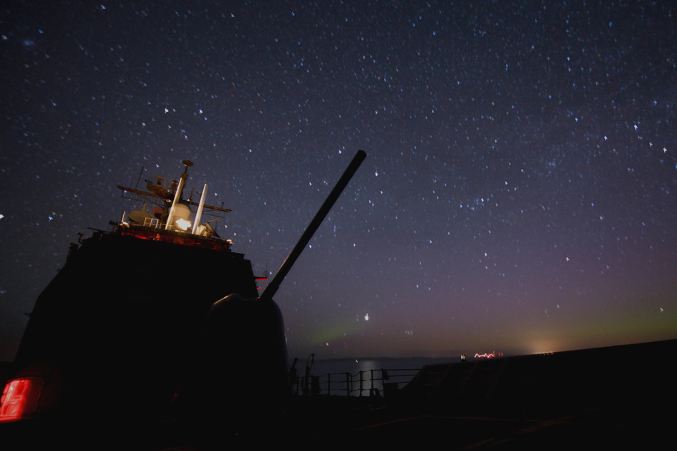 ATLANTIC OCEAN (April 17, 2015) The guided-missile cruiser USS Anzio (CG 68) transits the Atlantic Ocean. Anzio is participating in Joint Warrior, a United Kingdom-led training exercise designed to provide NATO and allied forces with a unique multi-warfare environment in which to prepare for global operations. (U.S. Navy photo by Mass Communication Specialist 2nd Class Abe McNatt/Released)