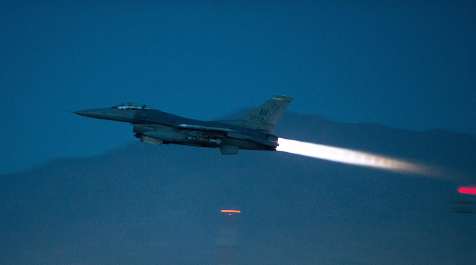 An F-16 Fighting Falcon aircraft assigned to the 555th Expeditionary Fighter Squadron from Aviano Air Base, Italy, takes off from Bagram Air Field, Afghanistan, May 23, 2015. The F-16 is a highly maneuverable, multi-role fighter aircraft that has proven itself in air-to-air and air-to-ground combat. (U.S. Air Force photo/Tech. Sgt. Joseph Swafford)
