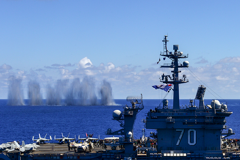 PACIFIC OCEAN (May 31, 2015) Sailors watch as ordnance is detonated during an air-power demonstration near aircraft carrier USS Carl Vinson (CVN 70). Carl Vinson and its embarked air wing, Carrier Air Wing (CVW) 17, are in the U.S. 3rd Fleet area of operations returning to homeport after a deployment to the U.S. 5th and 7th Fleets. (U.S. Navy Photo by Mass Communication Specialist 3rd Class Eric Coffer)