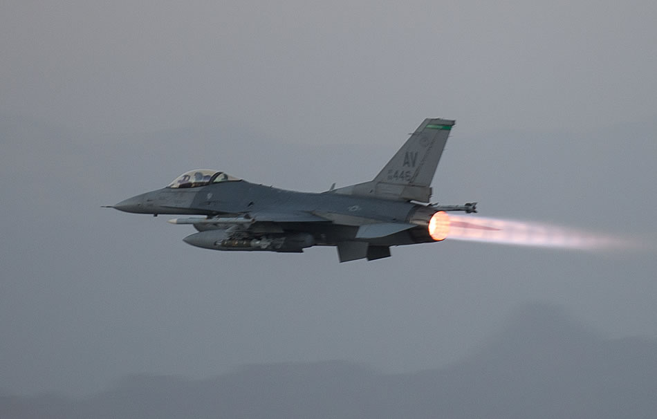 Capt. Dakota Olsen, a 555th Expeditionary Fighter Squadron F-16 Fighting Falcon pilot, takes off on a combat airpower mission June 17, 2015, at Bagram Airfield, Afghanistan. Olsen’s job was to provide close air support and armed overwatch for military personnel in Afghanistan. Various sorties and missions are flown throughout the country on a daily basis, providing airpower to ensure a safe and secure environment for personnel at Bagram Airfield. (U.S. Air Force photo/Tech. Sgt. Joseph Swafford)