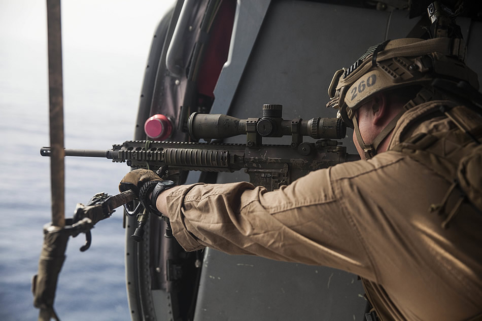 A U.S. Marine with the 15th Marine Expeditionary Unit’s Maritime Raid Force aims at his target out of an MH-60S Sea Hawk from the “Blackjacks” of Helicopter Sea Combat Squadron 21. Marines with the MRF practiced aerial sniping out of the helicopter to work on their accuracy shooting from the air. The 15th MEU is embarked on the Essex Amphibious Ready Group and deployed to maintain regional security in the U.S. 5th Fleet area of operations. (U.S. Marine Corps photo by Cpl. Anna Albrecht)
