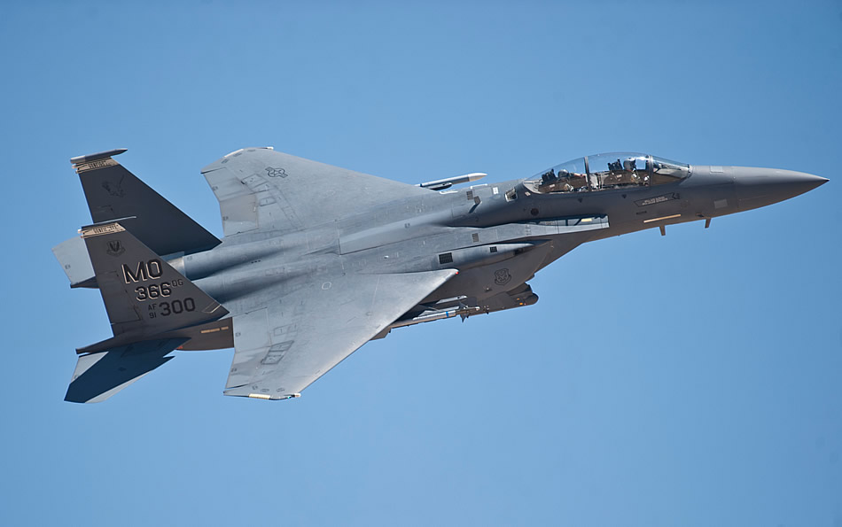 An F-15E Strike Eagle assigned to Mountain Home Air Force Base, Idaho, flies during a Red Flag 15-3 sortie at Nellis Air Force Base, Nev., July 13, 2015. The 366th Fighter Wing, assigned to Mountain Home AFB, is the lead wing of Red Flag 15-3 which is designed to provide a series of intense air-to-air combat scenarios for aircrew and ground personnel which will increase their combat readiness and effectiveness for future real-world missions.